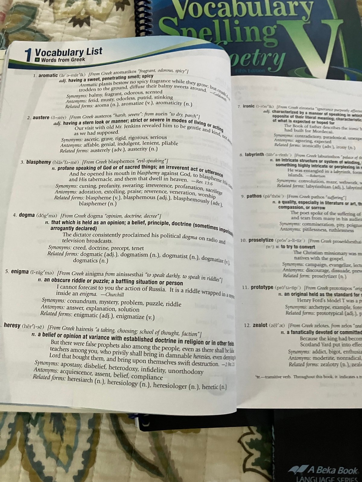 Abeka Vocabulary Spelling and Poetry V student workbook (crease on front cover)and teacher key