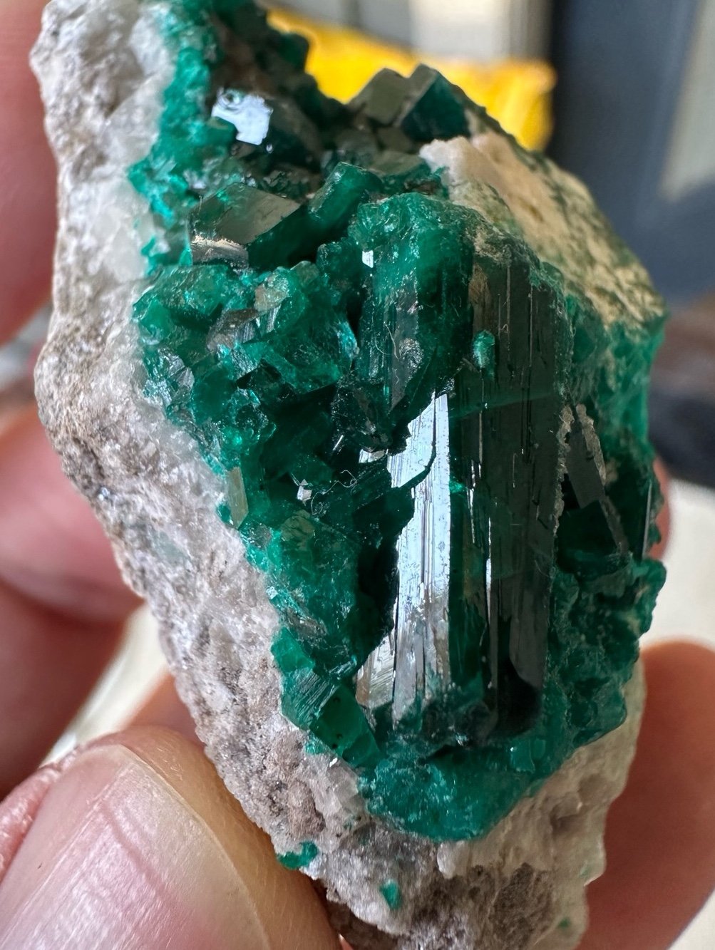 Mother Nature’s Art! This crystal made our Heart skip a beat! Dioptase is Our Favorite Shade of Green! This Lovely Piece Is Grown on a Calcite Matrix Was Collected from The Mindouli District, Pool Dept. D.R. Congo.